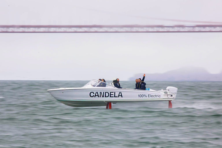 Pour la première fois sur le circuit de la voile, les catamarans volants seront accompagnés d'un bateau de poursuite tout aussi élevé : notre hydroptère électrique Candela C-7, qui sera utilisé par les invités VIP de l'équipe France SailGP et les médias pour regarder les courses de près. Tout comme la F50, le Candela est construit à 100% en fibre de carbone et utilise des hydrofoils pour soulever la coque au-dessus de la friction de l'eau et atteindre des vitesses élevées. Les hydrofoils confèrent également au C-7 une autonomie supérieure à celle de tout autre engin électrique conventionnel, permettant au Candela C-7 de naviguer pendant près de 2 heures à 30 mph, ce qui est plus que suffisant pour parcourir le circuit.