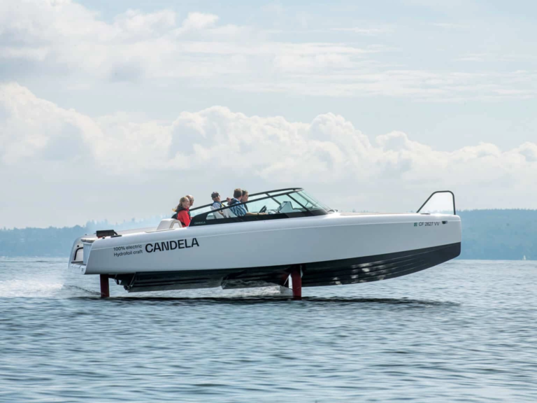 Candelas farkoster flyr over bølgene på datastyrte hydrofoiler - undervannsvinger - og bruker 80 % mindre energi enn konvensjonelle båter. Denne effektiviteten betyr langt lengre rekkevidde og høyere hastigheter på ren batteridrift.